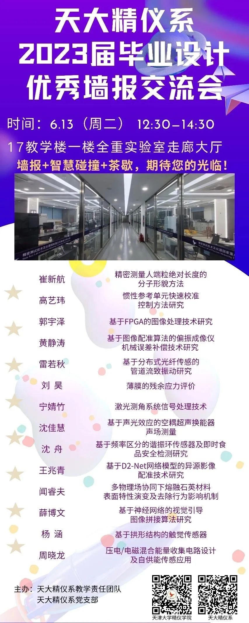 為深入開展學習貫徹習近平新時代中國特色社會主義思想主題教育,踐行“黨建+”工作模式,推動黨建與中心工作融合發展,6月13日,精密儀器工程系第一和第二黨支部和精密儀器工程系教學責任團隊聯合組織精密儀器工程系2023屆畢業設計優秀墻報交流會,活動在第17教學樓一樓全國重點實驗室順利召開。